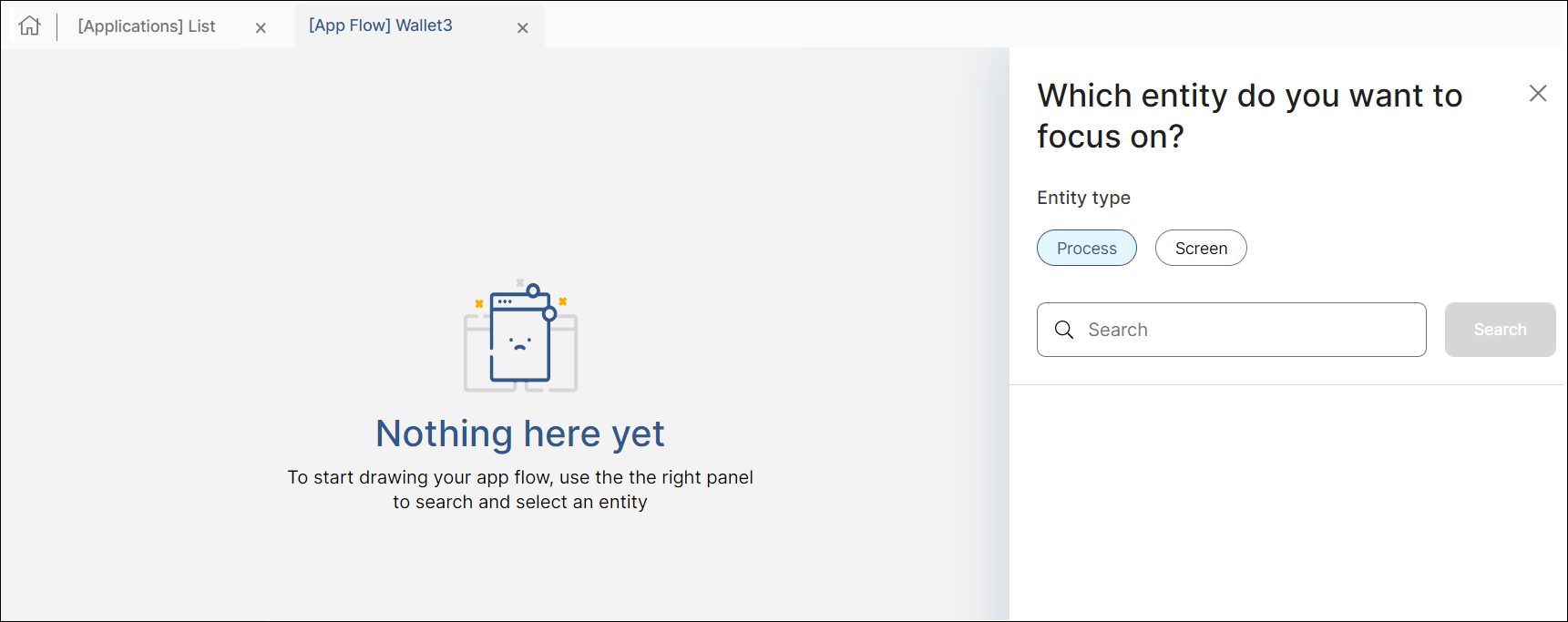 Una vez que se abra la pestaña [Flujo de aplicaciones], puede buscar diferentes entidades (pantallas o procesos) dentro de su aplicación. Para ello, haga clic en el chip de elección Pantalla o Proceso en el visualizador, introduzca el nombre de la entidad o una palabra clave y haga clic en Buscar. Tenga en cuenta que la búsqueda no es sensible a mayúsculas y minúsculas.