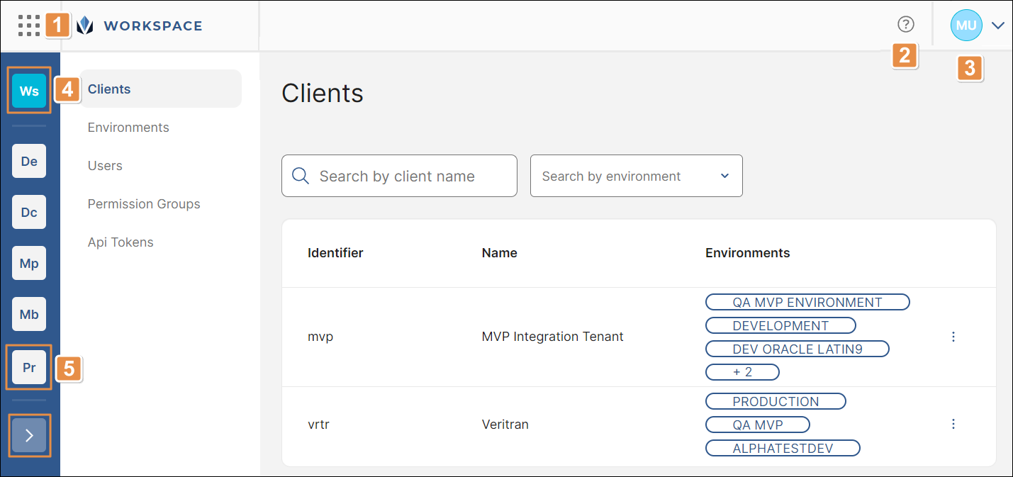 4. Workspace Accounts & Environments. Por defecto, la plataforma Workspace se abre en el módulo Workspace Accounts & Environments.