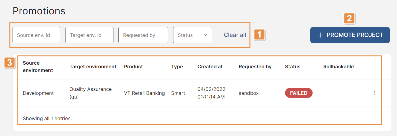 1. Barras de búsqueda y filtro de estado. Para buscar una promoción, haz clic en cualquiera de las barras de búsqueda e ingresa el nombre del ambiente de origen, el nombre del ambiente de destino o el usuario que solicita la promoción, según corresponda. Para limitar la lista de promociones por estado, haz clic en la flecha del filtro de estado y selecciona una opción de la lista desplegable. Los estados disponibles son: Success, On going, Failed, Dead. Para eliminar todos los filtros y ver la lista completa de promociones, haz clic en Clear all.