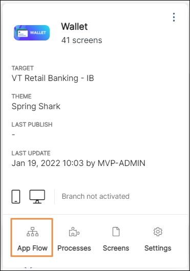 Puedes usar App Flow en módulos y ramas de la misma manera que lo harías con una aplicación. Haga clic en Global > Módulos o Global > Navegador de sucursales y haga clic en Flujo de aplicaciones en la tarjeta de su aplicación.