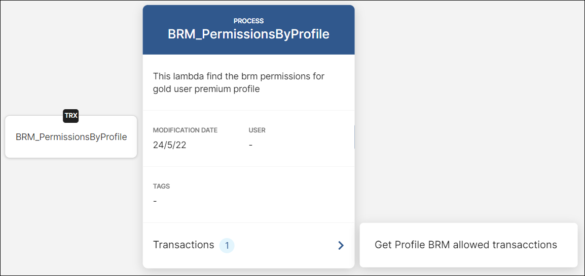 Transactions | Indicador que muestra si hay transacciones existentes dentro de ese proceso. Los procesos que contienen una función VT_TRANSACTION están marcados con una etiqueta TRX negra en el flujo, como se muestra en la imagen superior. Pase el cursor sobre el indicador Transacciones para ver la lista de transacciones dentro de ese proceso. |