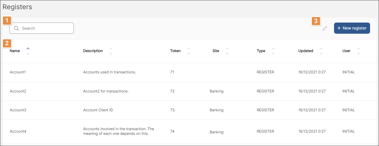 Barra de búsqueda. Barra de búsqueda. Busca registros por nombre, identificador o token.