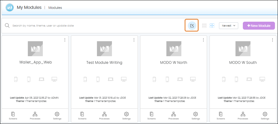 Studio le permite importar módulos previamente creados y exportados a su computadora. Para saber cómo exportar un módulo, lea Módulos.