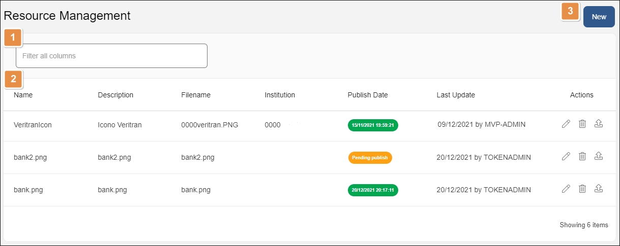 2. Lista de recursos. Se muestran todos los recursos cargados en el servidor para el producto seleccionado en el menú desplegable de productos. La información del recurso se divide en las columnas siguientes: